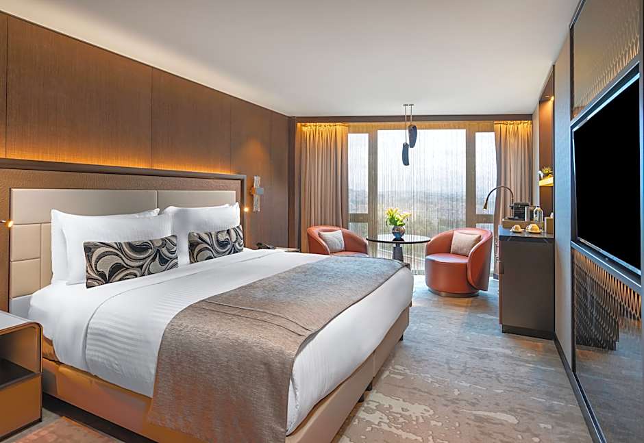 City View is 344 square feet and includes either a double bed 131-150 width or a king-size bed 150-183 width plus extra beds on demand, desk, satellite tv , cable tv, hairdryer, tea and coffee making facilities , ironing set, and safe.